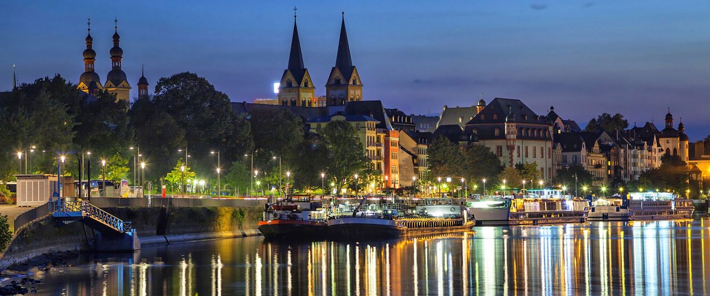 Eingebettet in eine wundervolle Umgebung empfängt Sie die Region um Koblenz mit dem UNESCO-Welterbe "Oberes Mittelrheintal" und dem schönen Moseltal. Sie lernen die Stadt am Zusammenfluss von Rhein und Mosel bei einem Stadtrundgang kennen. Entdecken Sie Highlights wie das Kaiser-Wilhelm-Denkmal am Deutschen Eck, den Schängelbrunnen am Rathaus und das Forum Confluentes mit dem Romanticum am Zentralplatz.